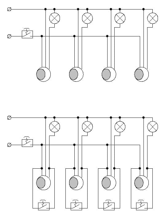 Добрый день! Поставил в деревне 4 прожектора с датчиками движения на каждой стороне дома. Подсоединил к электричеству все 4 провода от них в одной коробке + сделал ещё выключатель, чтобы включать питание на них и они работали от датчиков движения и второй, что бы включать прожектора отдельно. Как подключено не помню, но всё работает как хотел.
