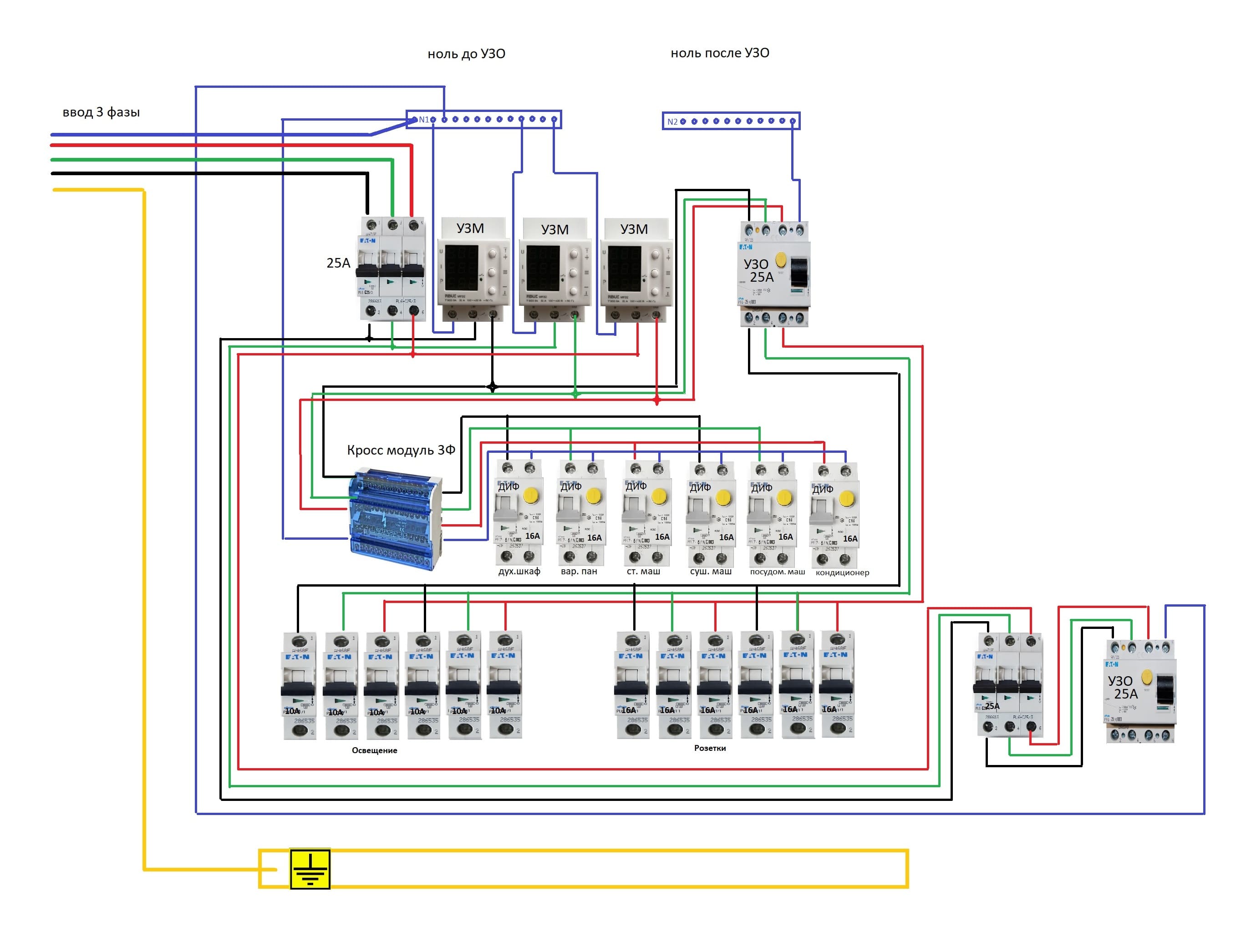 Параллельно через кросс модуль запитаны диф автоматы на бытовую технику. Все дифы 16А.