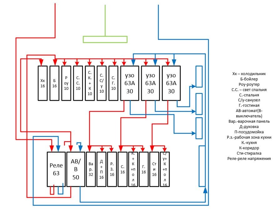 - развитие схемы должно быть слева направо и сверху вниз, без возвратов. Получится: 1-й ряд - реле напряжения, УЗО1+его групповые автоматы, УЗО2+его групповые автоматы, ...
