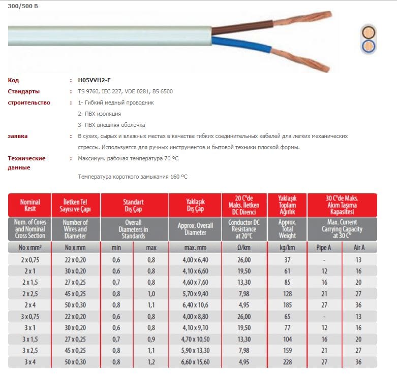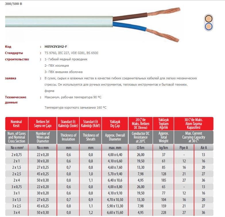 Здравствуйте, имеется турецкий кабель (может это и не кабель, хочу выяснить) от компании KOC KABLO, но у них на сайте к сожалению подобную модель я не нашел, покупал метрами по этому этикетки с бабины нету. в том что это кабель этой фирмы сомнений нету, писал им на почту они подтвердили что это ихнее производство, но вот в списке продуктов у них на сайте я не нашел CYKYLO-F (еще есть CYKYLO-U с однопроволочными/сухими жилами) вчера попросил у них дать характеристики этого кабеля, но ответа пока не получил.