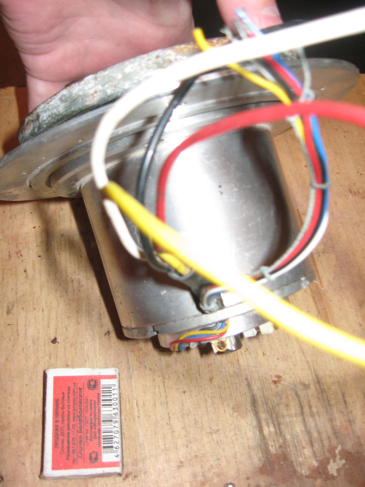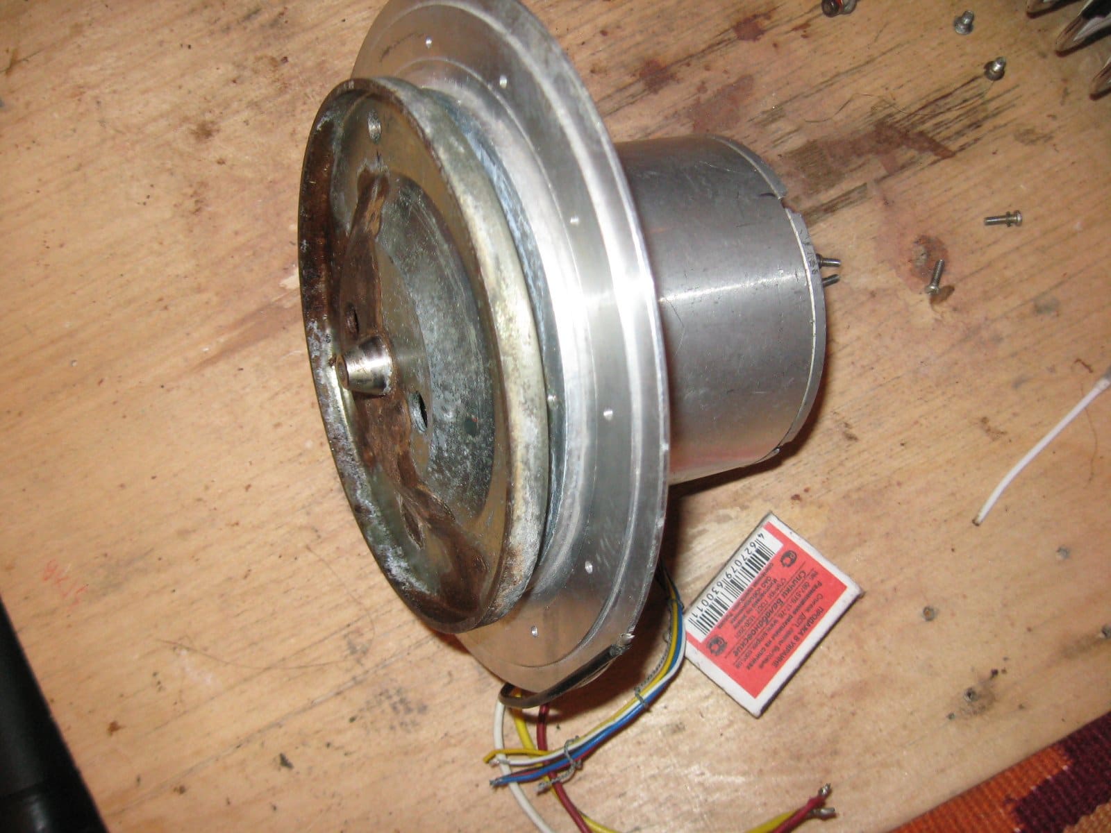 Весь алюминиевый. Два шкива - маленький алюминиевый (на фото снят) с одной стороны и с другой железный. Со стороны алюминиевого шкива электроплата с фототранзисторами. На плате маркировка "7К", (дальше или "П" или 11) потом "87". Похоже на серводвигатель или шаговый, так как проводов выходит 4 силовых и 5 управляющих.