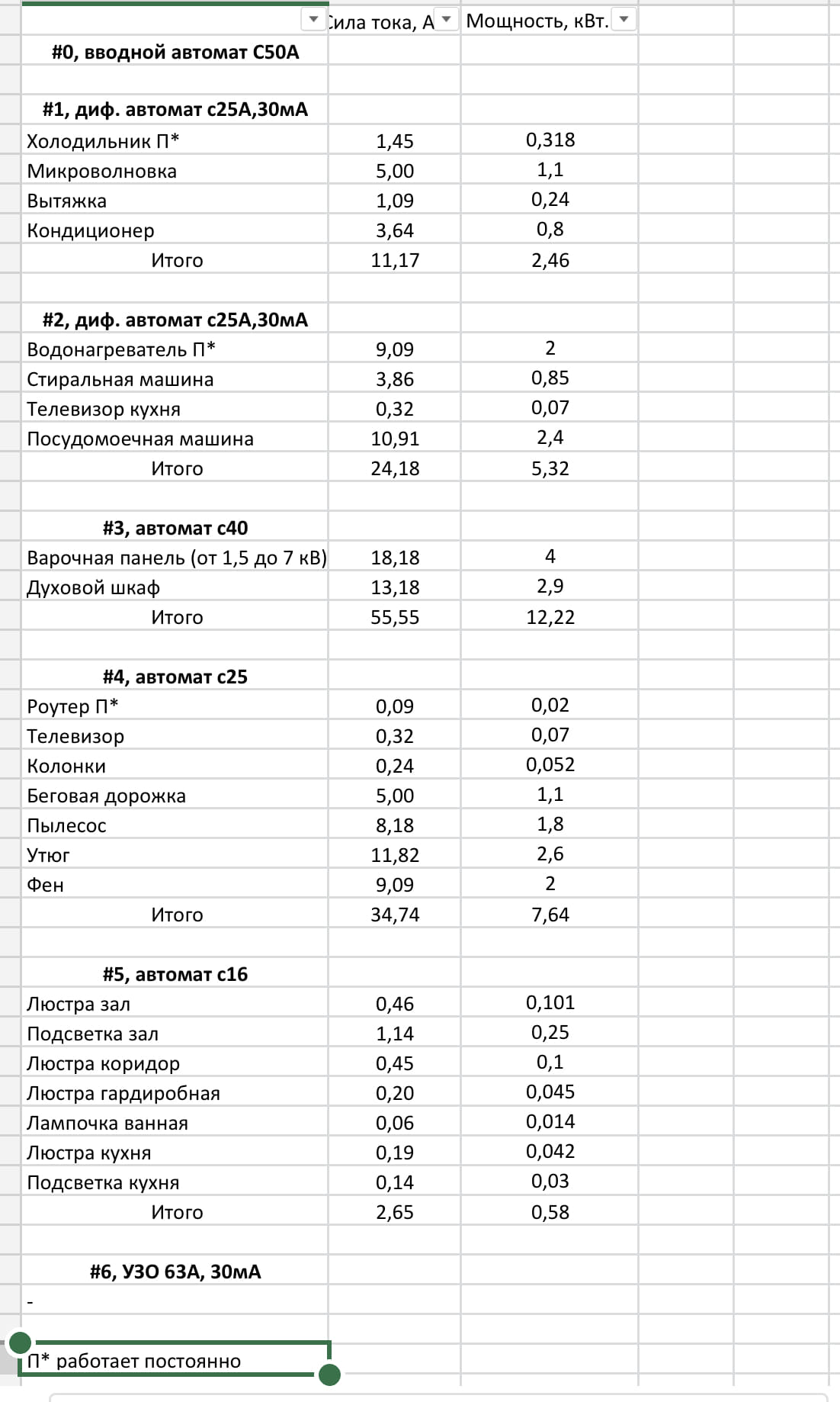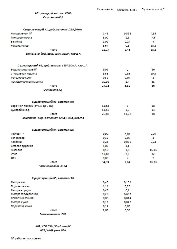 решил залезть в домашний щиток с целую узнаю почему не работает узо, оказалось что к нему в принципе не подключены никакие автоматы, сначала хотел просто его подключить к незащищенным автоматам, но посчитав силу тока на электроприборах решил, что добрая часть автоматов по номиналу току в щитке завышена, прошу в помощи в подборе автоматов. Фото щитка и таблицу с потребителями прикладываю, прошу не предлагать прокладывать новые линии в стенах :)