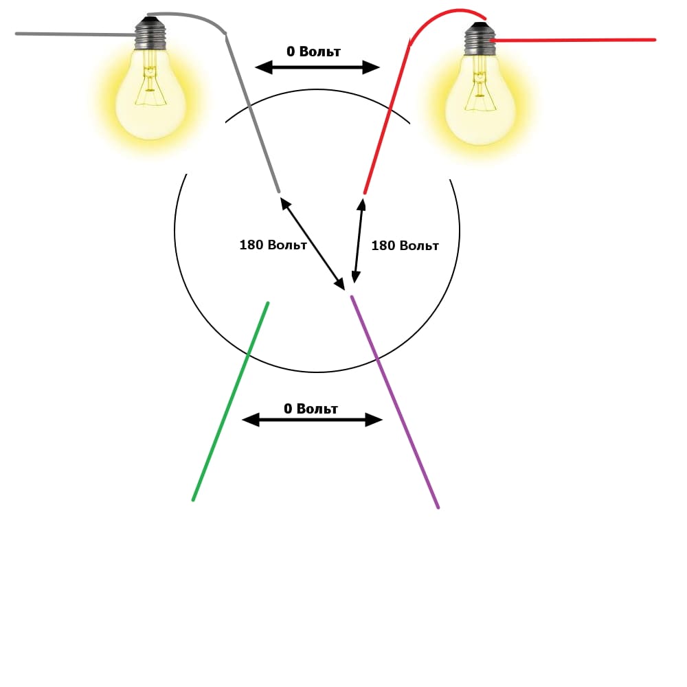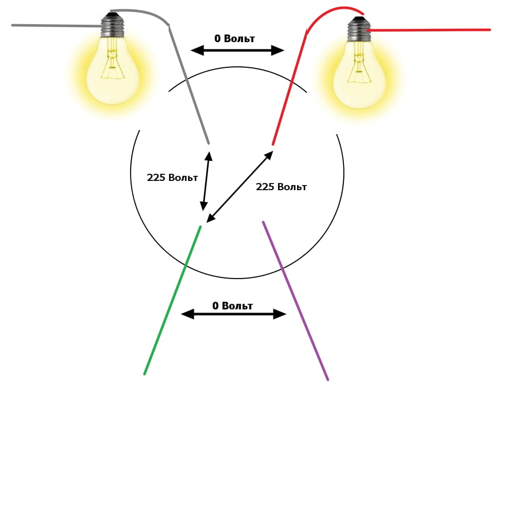 При замере напряжения от зеленого к лампочкам у меня показало 225 Вольт, если перекинуть его на место фиолетового получается КЗ