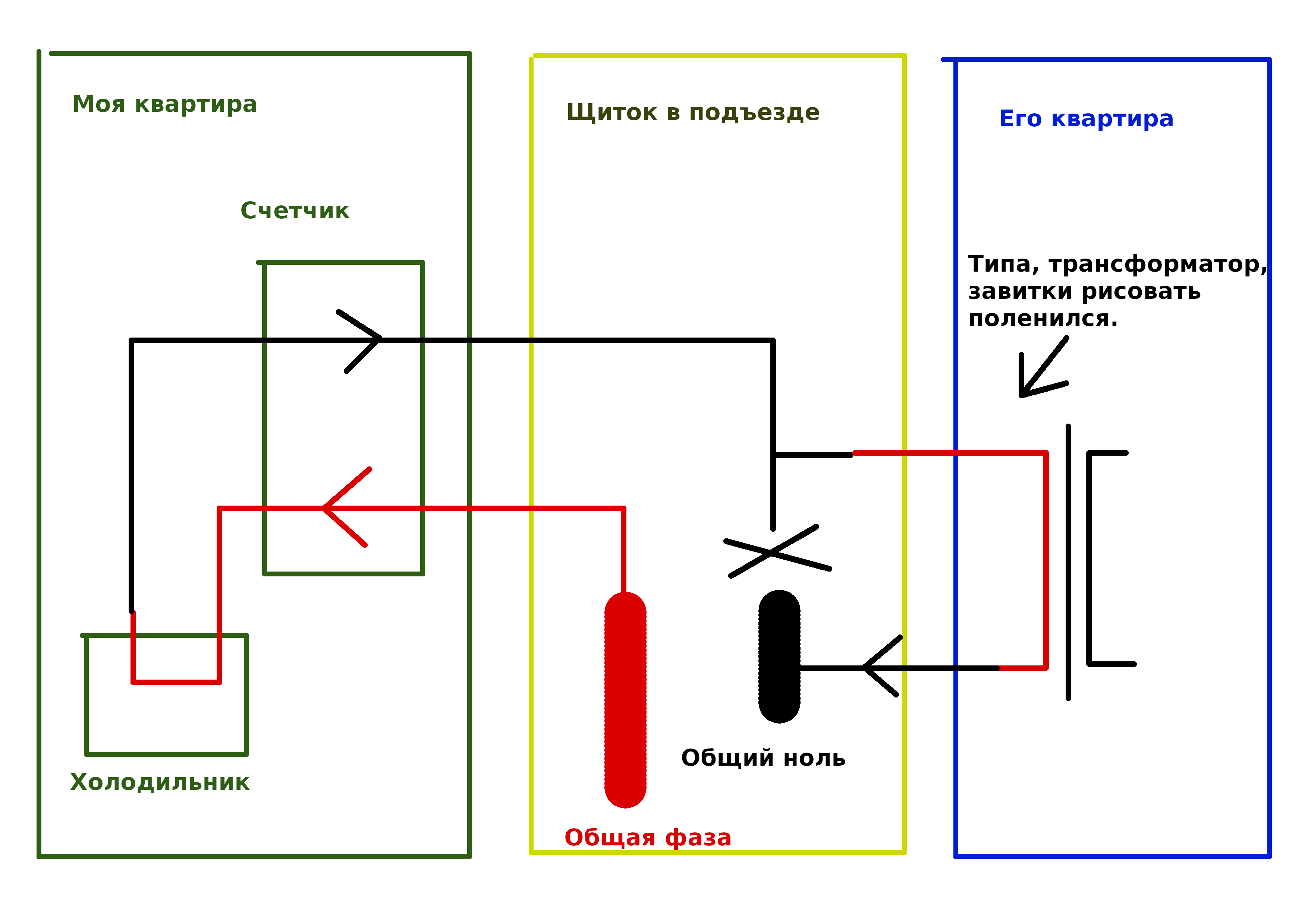 Скорее всего, ток в его квартиру потечет по его собственным жилам ... через его счетчик.Если он оставил ноль от моего счетчика подключенным к нулю в подъезде, как было; потечет ли ток в его квартиру через его хитрую жилу? Через его нагрузку?