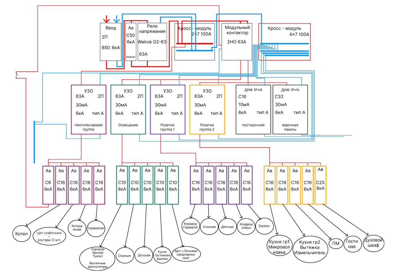 Ноль от потребителей тоже рисовать не стал. От каждой группы будут подключены в свою шину из под УЗО на кросс-модуле, кроме неотключаемой группы, она в кросс-модуль не поместилась, поэтому просто на отдельной шине будет