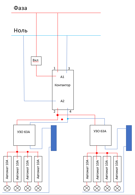 Хочу реализовать мастер-выключатель через контактор на две группы света. (во вложении схема)