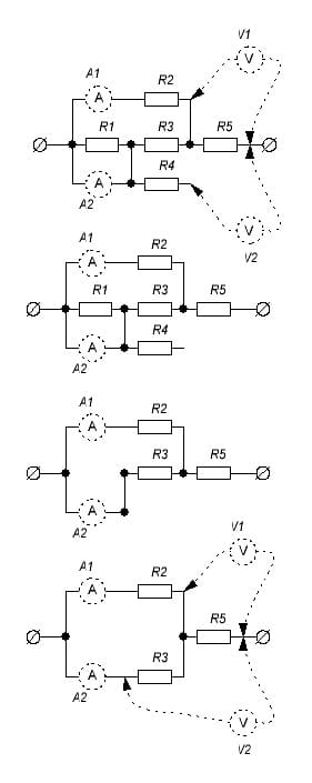 А если считать, что амперметры включены в разрыв провода, то из схемы убираются только линии, относящиеся к вольтметрам ... тогда, после ряда упрощений (замещений) схема принимает очень простой вид и из которой получаем те же значения, кроме показания амперметра А1 ... он тоже будет 20 мА (а не 0)TOPMO3 писал(а):Источник цитаты Задачка с подвохом ...