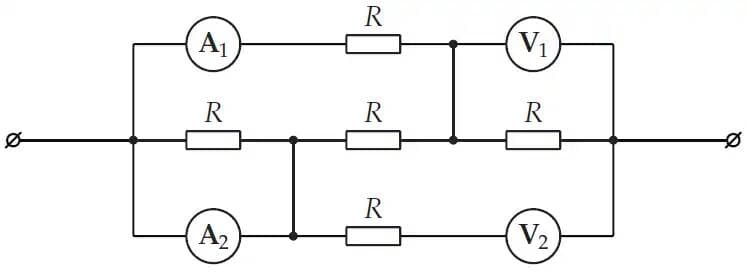 В цепи, изображённой на рисунке, все приборы идеальные, а резисторы одинаковые. Выводы цепи подключены к источнику постоянного напряжения, при этом через амперметр А2 течет ток, равный 20 мА, а вольтметр V5 показывает напряжение 6В.