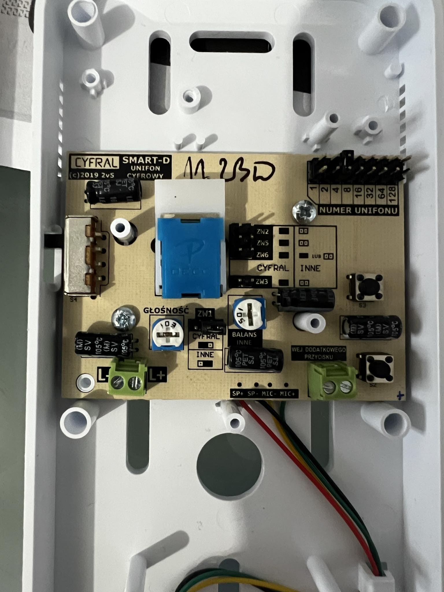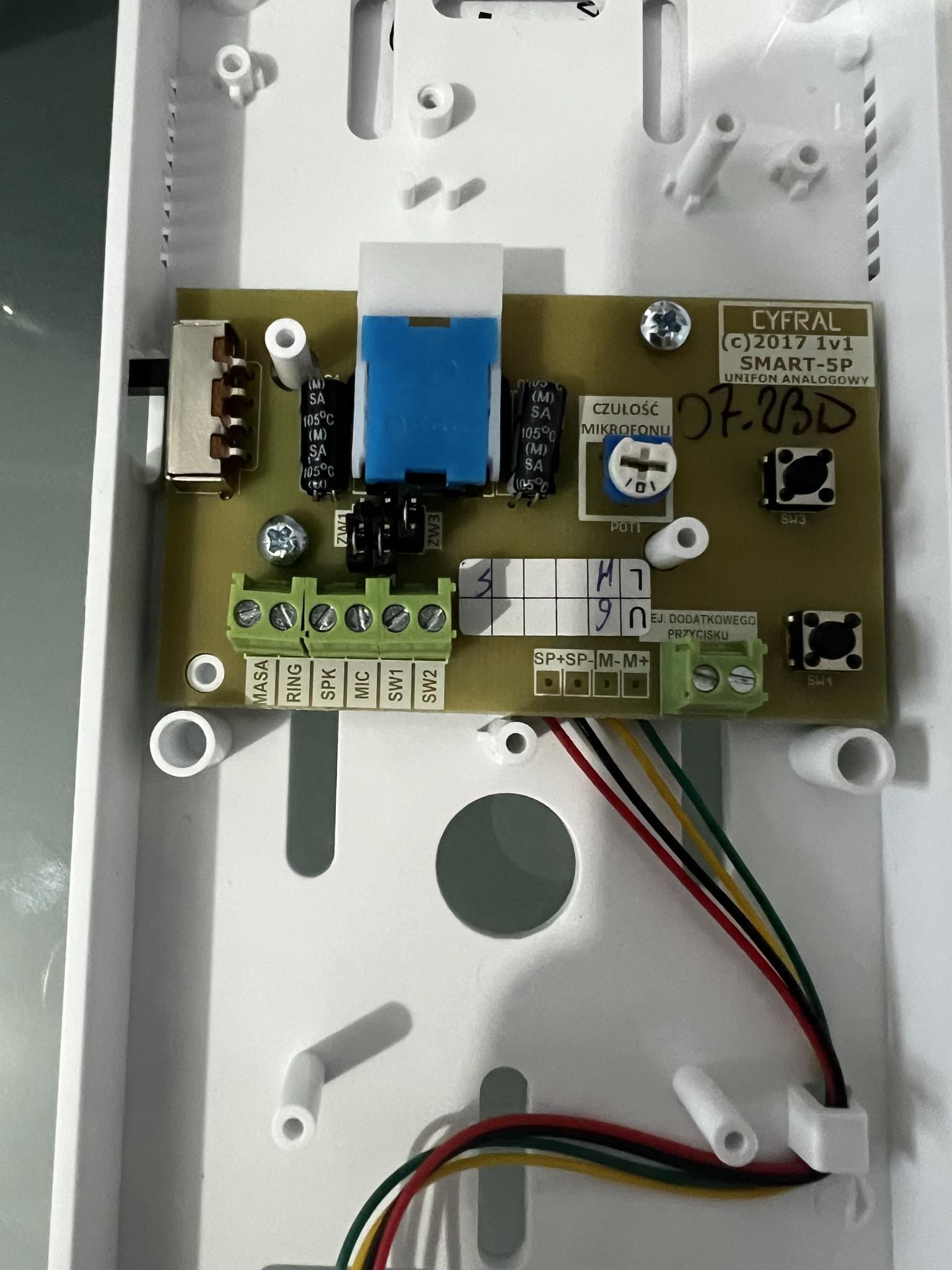 Методом проб и ошибок, а также, по средству снятия платы с корпуса я понял, что коричневый и зеленый провод (при смыкании открывают дверь подъезда) нужно подключить к SW1 и SW2.