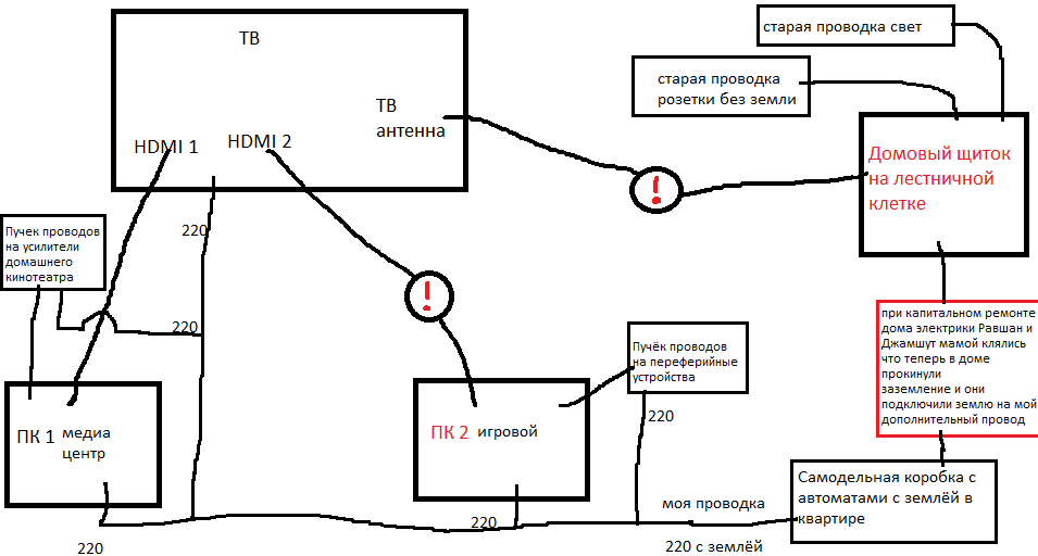 Живу в старой девятиэтажке с алюминиевой проводкой без заземления. Из общего щитка в квартиру провел медный кабель с заземлением и установил внутри квартиры коробку с автоматами на технику для кухни и гостиной. Кабель в щитке лет десять назад подключал электрик, разводкой в квартире занимаюсь сам. Пару лет назад в доме делали капитальный ремонт, протянули между этажами новую проводку в том числе сказали, что теперь появилось заземление. Поймал на этаже двух электриков которые это всё подключали и попросил их не забыть подключить землю на мой провод, а не как раньше на рамку дверцы. На ломанном русском вроде как объяснились и вроде как меня поняли. Суть проблемы такова: Есть два ПК подключенные к одному ТВ. От ПК1 (медиа центр с усилками, колонками, домашним кинотеатром, куча проводов короче) идёт кабель HDMI1 к ТВ (тут проблем нет) ещё есть ПК2 (игровой) от него идёт кабель HDMI2 к этому же ТВ и есть домовая ТВ антенна, идёт из общего щитка к ТВ. Если кабель HDMI2 или ТВ антенна подключены к ТВ по отдельности то проблем нет, если же их подключить одновременно то в щитке на лестничной клетке вылетает автомат (посмотрел вроде это не узо а обычный автомат) Магия в том, что при подключении антенны может выбить сразу, или через несколько минут или часов, один раз проработало весь день и выбило часа в три ночи когда все спали и все устройства были выключены. :mad: В поисках решения начитался всякого про гальваническую развязку антенны :blush: купил бочёнок грозозащиты и накрутил на антенный кабель перед входом в ТВ, естественно не помогло вот и пишу сюда :help: