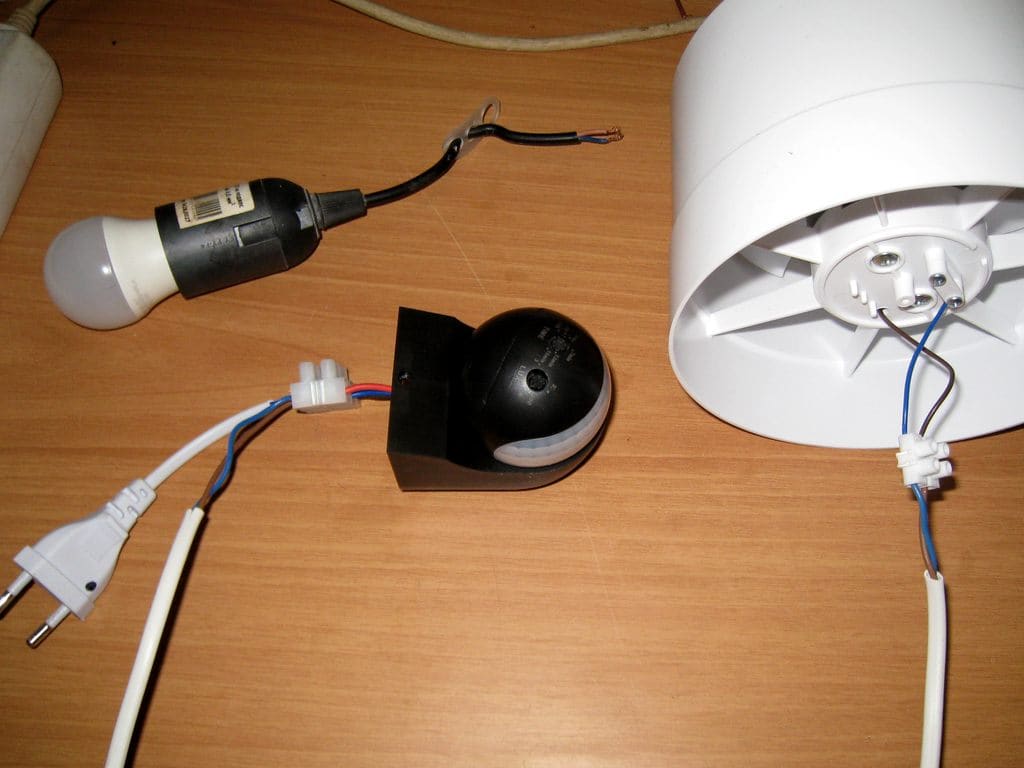 Простейший китайский датчик движения (800W max) с таймером, нормально работает со светодиодной лампой, но задача — вытяжка.