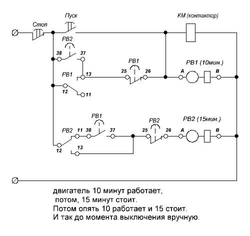 elalex, cпасибо за ответ, но что-то ничего подходящего не нашел. В основном схемы расчитаны на одиночное включение или выключение двигателя через определенное время, а мне, же нужно , что-бы было так , например : двигатель 10 минут работает, потом, 15 минут стоит.Потом опять 10 работает и 15 стоит.И так до момента выключения вручную.Знаю ,что для решения задачи нужно иметь два релле времени. Они у меня имеются.А вот бы нормальная схема , не помешала. Спасибо.
