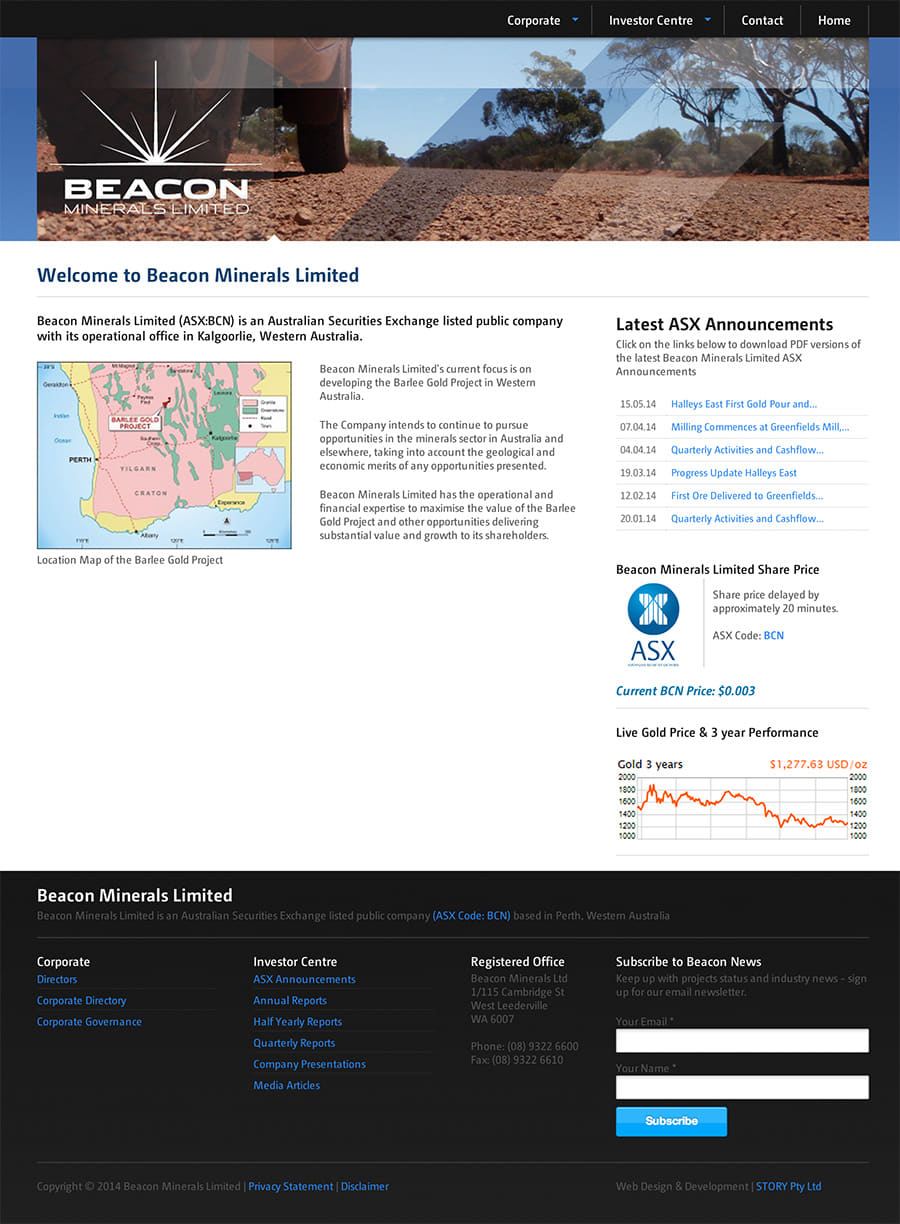 The Story Group built a easy to use content management system so the company can manage their ASX Announcements and other company content. Beacon Minerals Limited also manage and send regular newsletters to their large subscriber base - subscribers can manage their subscription details though the site.