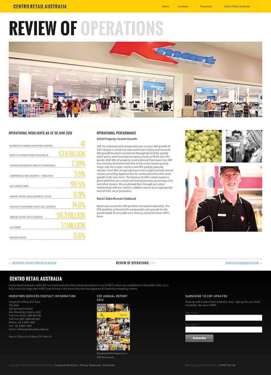 The Story Group built two websites for the Centro Property Group. Both sites contained a large amount of financial data as well as general company information. Being able to navigate to the particular area of interest quickly and easily was of particular importance to the viewing audience.