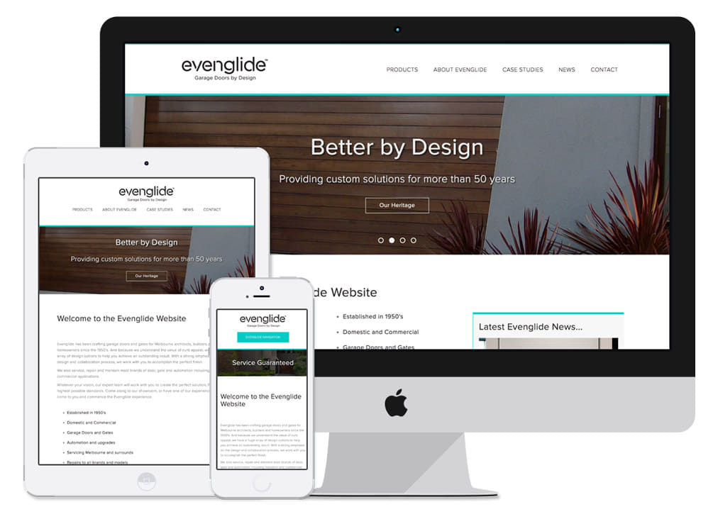 Evenglide offer a huge variety of quality doors, gates, remote control solutions for all products including service and repairs to all brands. The fully responsive website allows staff to easily add, edit and delete products, news and documents.