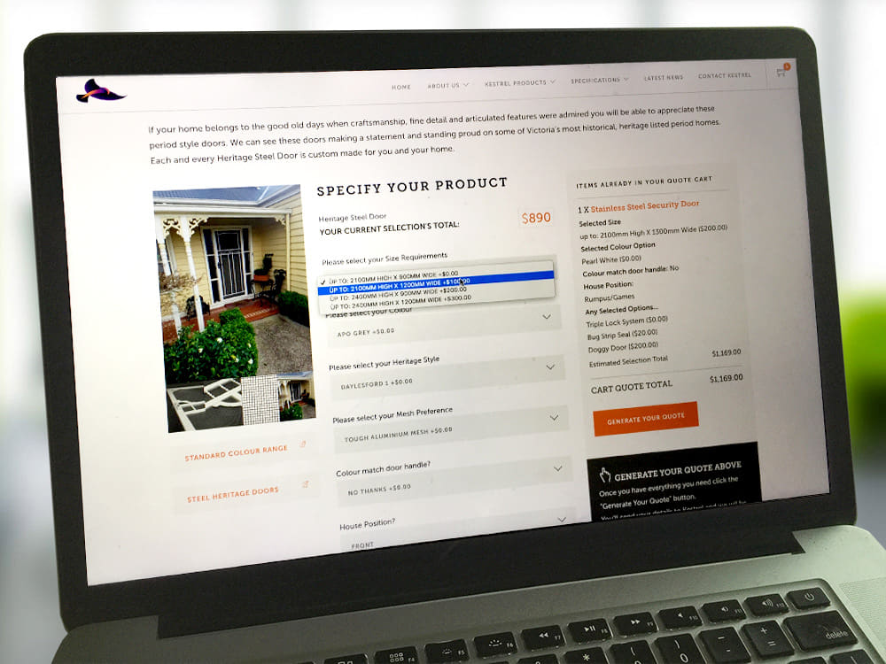 Kestrel wanted a system that provided immediate visual feedback on price. As the customer selected the many options available to them the quotation price had to dynamically change to represent these choices. A customer could determine their most desired options and pick and choose appropriately based on their budget. Of course, the site had to work seamlessly across devices - desktop, laptop, tablet, and smartphone.