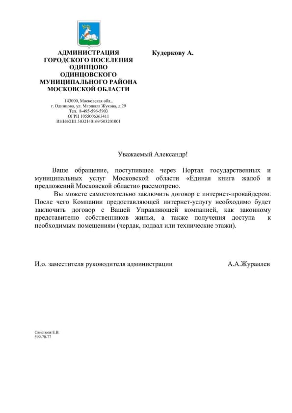 УК Сервис 24 разрешили МГТС войти в наш ЖК при условии, что сначала те включат ЖК Барбарис в Бибирево.