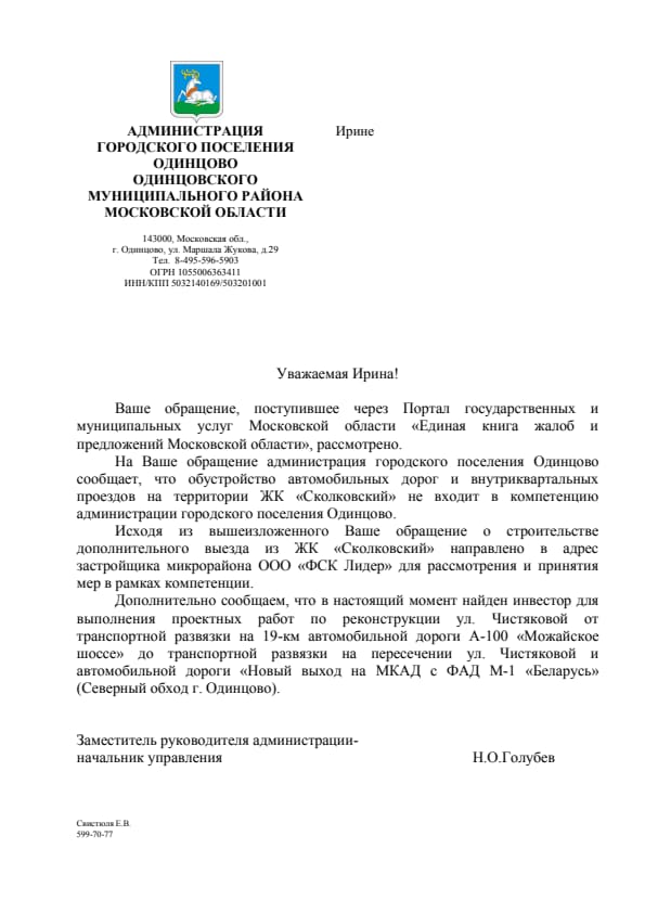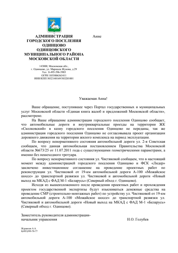 Предлагаю в этой теме собираться все отписки, которые мы получаем из разных органов, чтобы видеть общую ситуацию. А то иногда бывает так, что в одном месте ответили, что, например, дорога будет построена из бюджета Одинцовского района, а в другом месте ответили, что дорога будет построена на деньги Лидера, а в итоге мы до сих пор без дороги. А так мы сразу увидим нестыковок и другие проблемы и попробуем на них повлиять. Личные данные, конечно, можно удалять, но это личное дело каждого. Обращение публиковать необязательно, но если без него в ответе не разобраться, то лучше и его добавить.