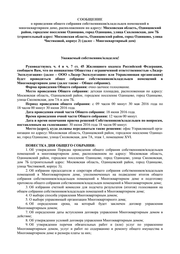 Руководствуясь ч. 4 и ч. 7 ст. 45 Жилищного кодекса Российской Федерации, сообщаем Вам, что по инициативе Общества с ограниченной ответственностью «Лидер-Эксплуатация» (далее – ООО «Лидер-Эксплуатация» или Управляющая организация) будет проводиться общее собрание собственников/владельцев помещений в Многоквартирном доме (далее также – Общее собрание).