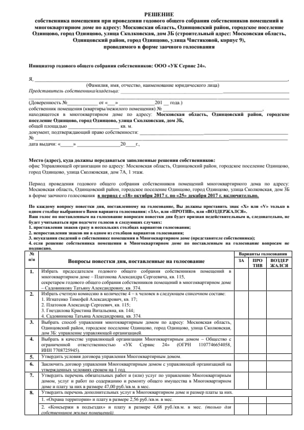 Так как при подсчете голосов будут законодательно учитываются только голоса собственников жилья, настоятельно рекомендуем подавать бюллетени голосования в УК только после получения Вами собственности на ваши квартиры. В противном случае Ваши голоса законодательно засчитаны не будут. При заполнении бюллетеней будьте внимательны! Аккуратно заполняйте всю необходимую информацию, иначе ваши голоса не засчитаются.