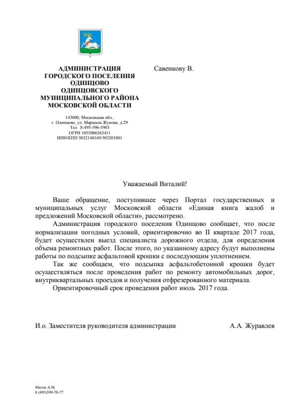 Дорожное полотно было разбито спецтехникой застройщика при обустройстве съезда на Северный обход Одинцово. Как сообщил руководитель муниципалитета, уже есть предварительная договоренность со строительной компанией о финансировании работ по восстановлению покрытия.