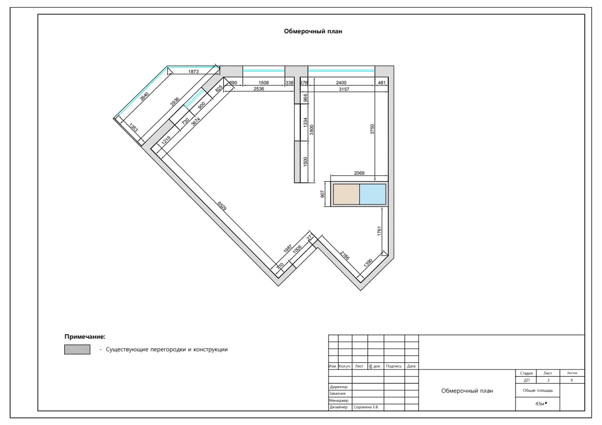 Также выкладываю обмерочный план однокомнатной квартиры из 8 корпуса 5 секции 44,3 кв м.