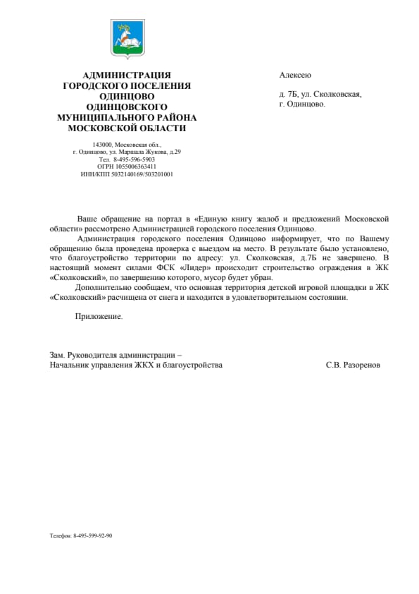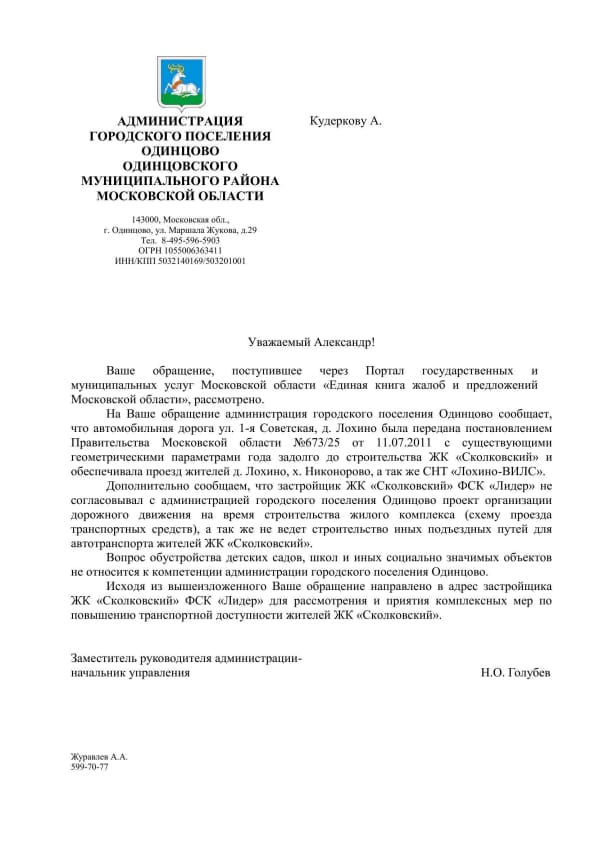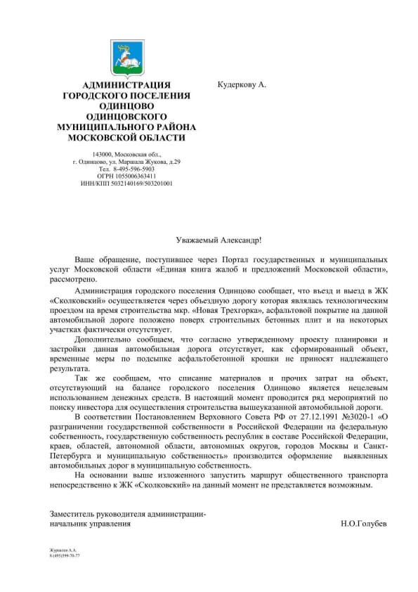 Предлагаю в этой теме собираться все отписки, которые мы получаем из разных органов, чтобы видеть общую ситуацию. А то иногда бывает так, что в одном месте ответили, что, например, дорога будет построена из бюджета Одинцовского района, а в другом месте ответили, что дорога будет построена на деньги Лидера, а в итоге мы до сих пор без дороги. А так мы сразу увидим нестыковок и другие проблемы и попробуем на них повлиять. Личные данные, конечно, можно удалять, но это личное дело каждого. Обращение публиковать необязательно, но если без него в ответе не разобраться, то лучше и его добавить.