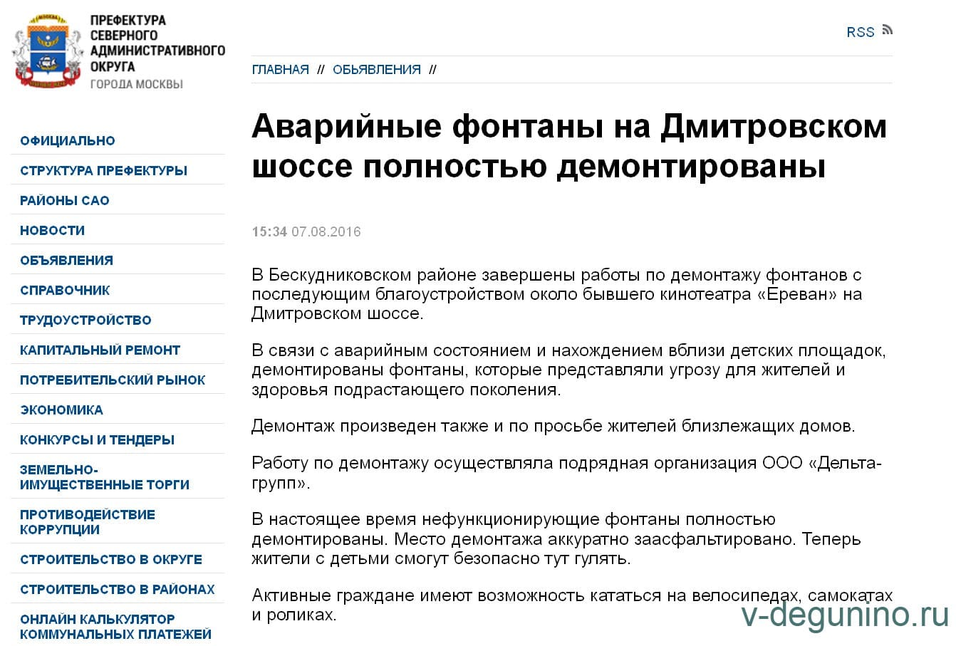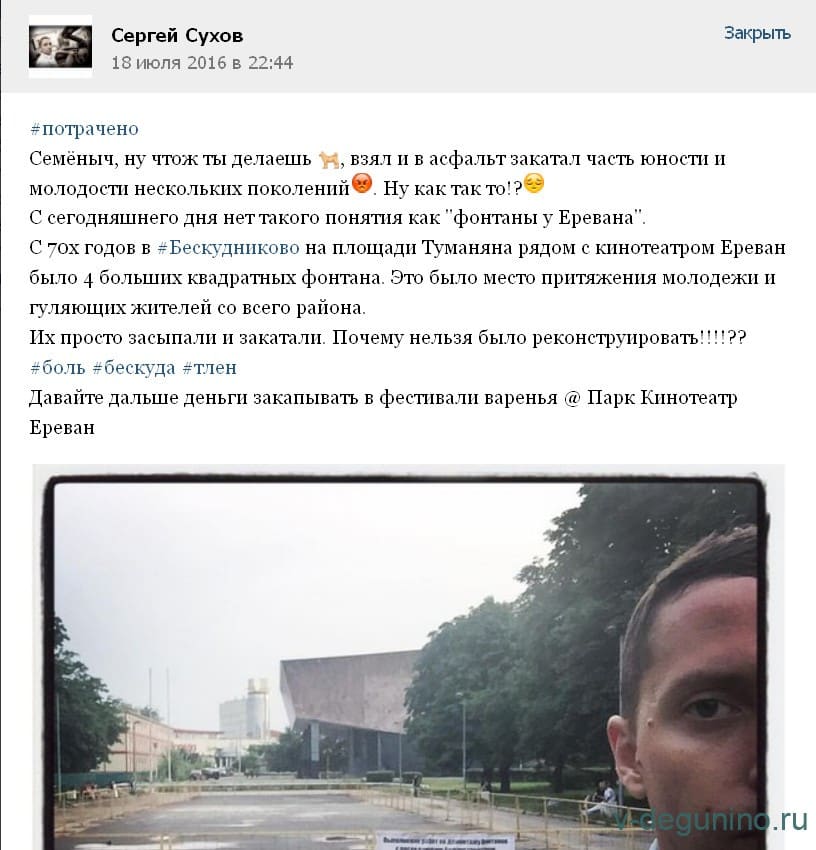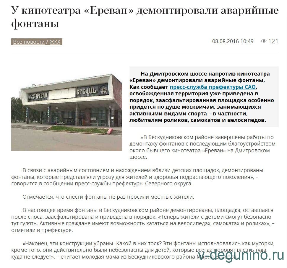 30 мая 2016 года Глава управы Бескудниковский подписала Приказ об уничтожении фонтанов у кинотеатра Ереван почти за 2 миллиона рублей