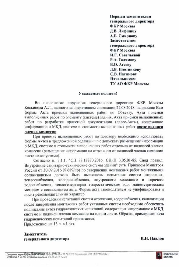 Письмом по ФКР Москвы от 28.08.2018 №ФКР-19-182064/8 введены новые формы Акта приемки выполненных работ по Объекту, Акта приемки выполненных работ по элементу (системе) здания, Акта приемки выполненных работ по разработке проектной документации, содержащие информацию о МКД, системе и стоимости выполненных работ ПОСЛЕ ПОДПИСИ ЧЛЕНОВ КОМИССИИ.