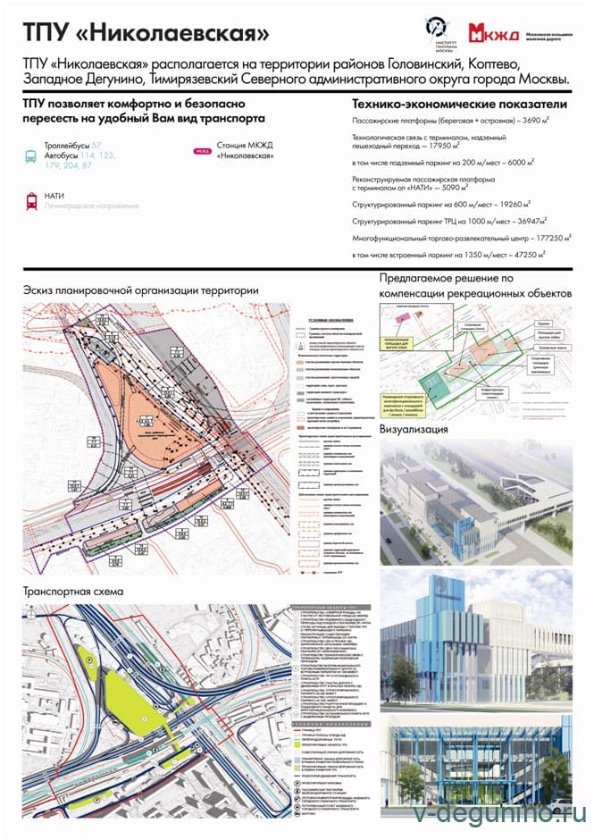 Как уточнили в Москомстройинвесте, ТПУ займет свободный участок площадью 0,38 га. Он расположится на границе двух административных округов Москвы: в районах Бескудниковский, Западное Дегунино, Головинский, Коптево, Тимирязевский САО и в районах Отрадное и Марфино СВАО. Основными планировочными и транспортными связями этой территории являются Дмитровское шоссе, 1-й и 3-й Нижнелихоборкий проезды, улица Линии Октябрьской Железной Дороги, Верхнелихоборская и Станционная улицы, Локомотивный, Гостиничный и Сигнальный проезды. ТПУ "Николаевская" будет обеспечивать хорошее транспортное сообщение со станциями метро "Петровско-Разумовская" и "Владыкино".