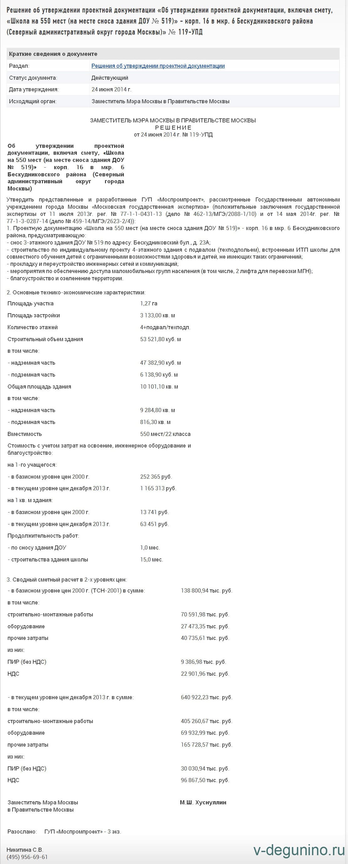 Решение об утверждении проектной документации «Об утверждении проектной документации, включая смету, «Школа на 550 мест (на месте сноса здания ДОУ № 519)» - корп. 16 в мкр. 6 Бескудниковского района (Северный административный округ города Москвы)» № 119-УПД
