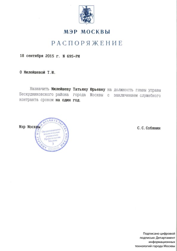 Главой управы Бескудниковского района города Москвы стала ранее исполнявшая обязанности главы управа района Бескудниковский САО Татьяна Юрьевна Милейшева.