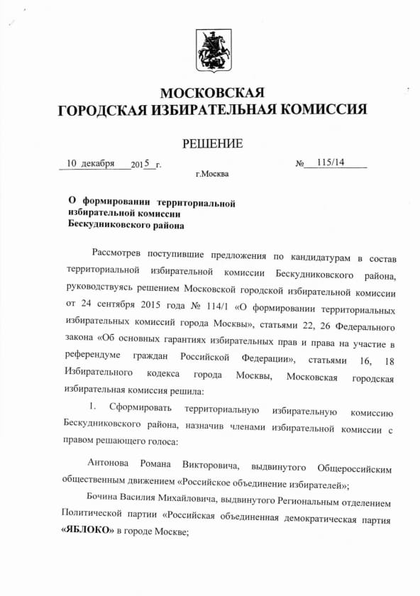 Решение Московской городской избирательной комиссии № 115/14 от 10 декабря 2015 года