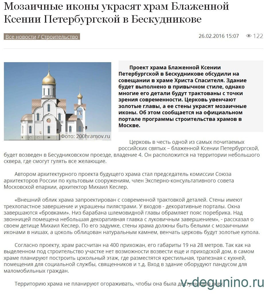 В начале года городские власти рассчитывают согласовать проект строительства храма в честь Святой Блаженной Ксении Петербургской, который планируется возвести в Бескудниковском проезде в одноименном районе Северного округа. Об этом сообщил депутат Госдумы РФ, куратор городской программы по строительству православных храмов Владимир Ресин.