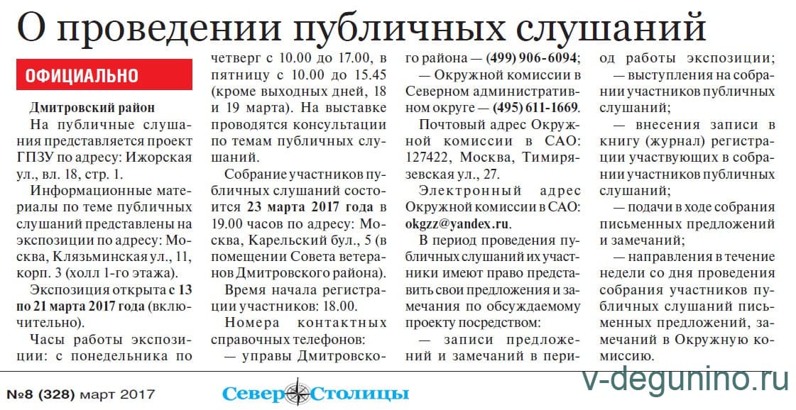 Собрание участников публичных слушаний состоится 23 марта 2017 года в 19.00 часов по адресу: г. Москва, Карельский бульвар, д. 5 (в помещении Совета ветеранов Дмитровского района).