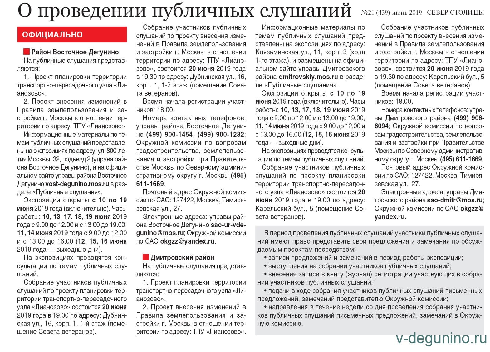 20.06.2019 г. Собрание публичных слушаний Дмитровский р-н: ТПУ Лианозово
