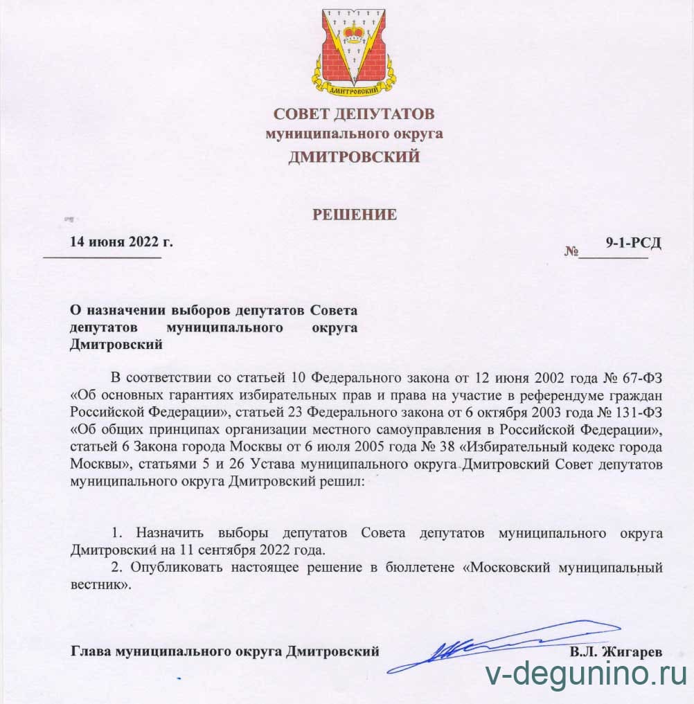 1. О назначении выборов депутатов Совета депутатов муниципального округа Дмитровский.