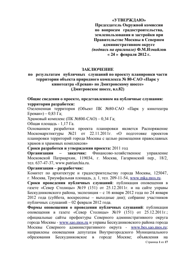 Сведения о протоколе публичных слушаний: протокол публичных слушаний по проекту Градостроительного плана земельного участка (ГПЗУ) для строительства православного храма на территории объекта природного комплекса №80-САО «Парк у кинотеатра Ереван», утвержден председателем Окружной комиссии по вопросам градостроительства, землепользования и застройки при Правительстве Москвы в Северном административном округе города Москвы (протокол ).
