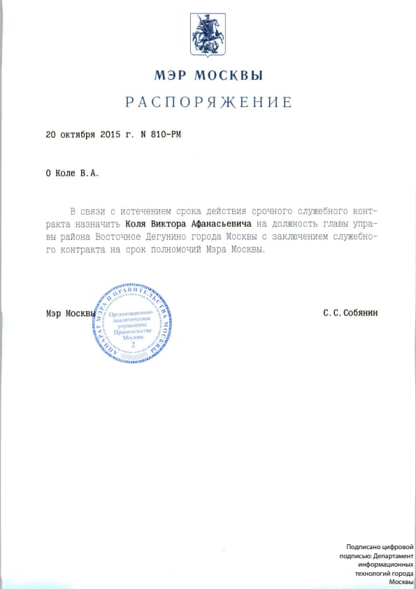 Распоряжение мэра Москвы № 810-РМ от 20.10.2015 «О Коле В.А.»