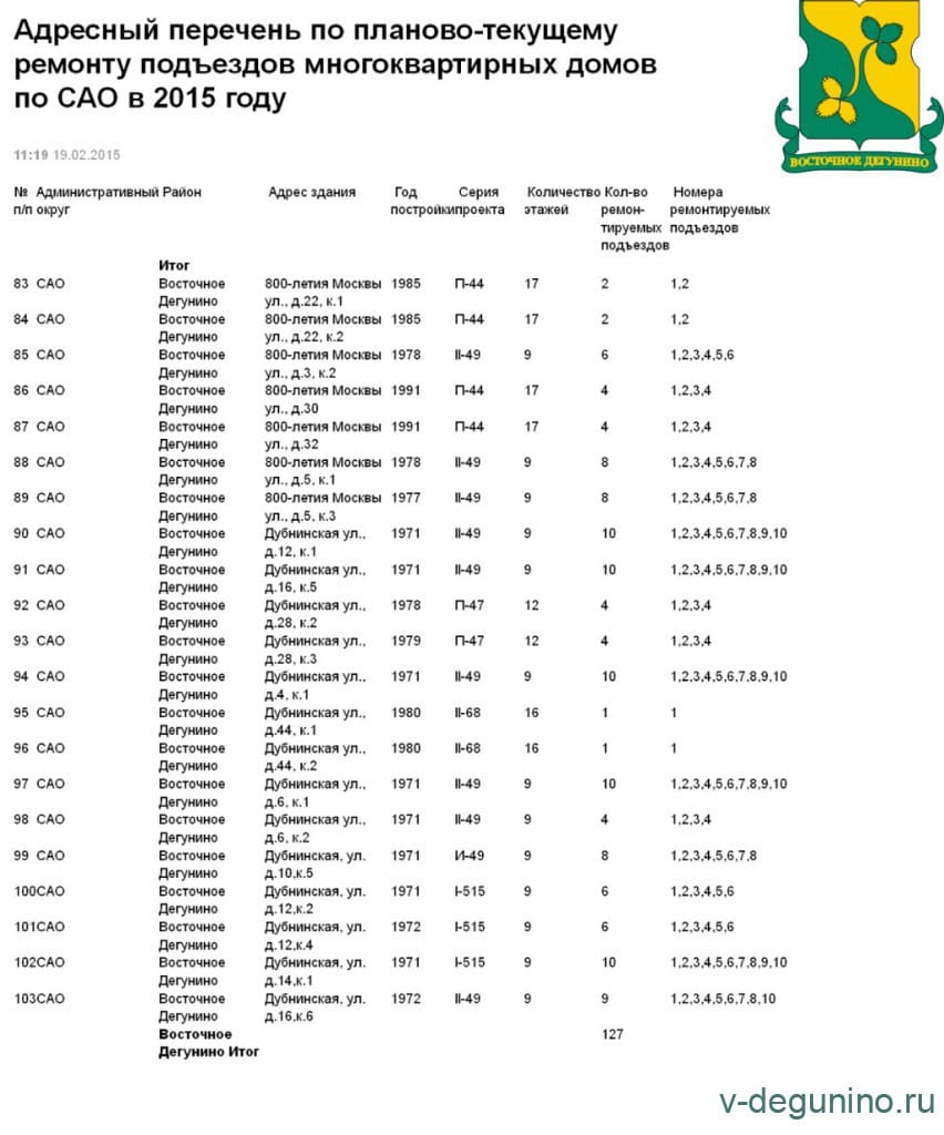 Адресный перечень по планово-текущему ремонту подъездов многоквартирных домов по району Восточное Дегунино САО в 2015 году