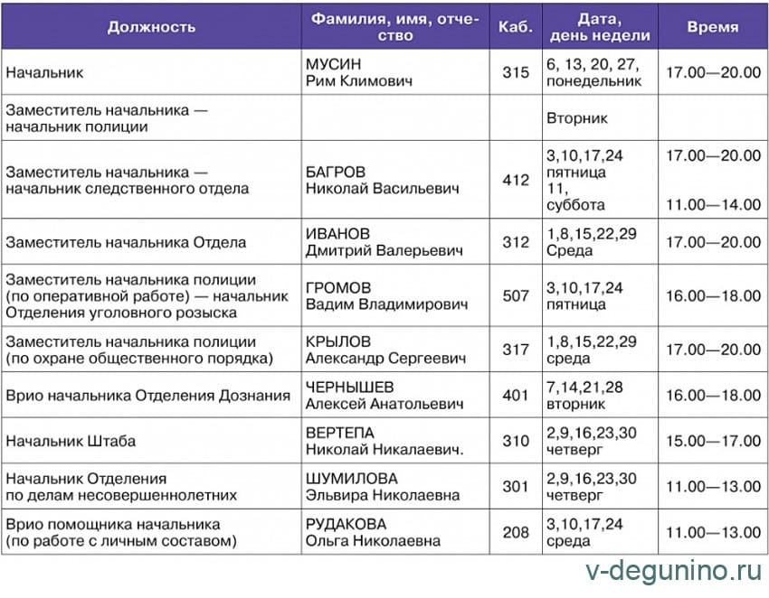 График приема граждан руководящим составом ОМВД России по району Восточное Дегунино на апрель 2015 г.
