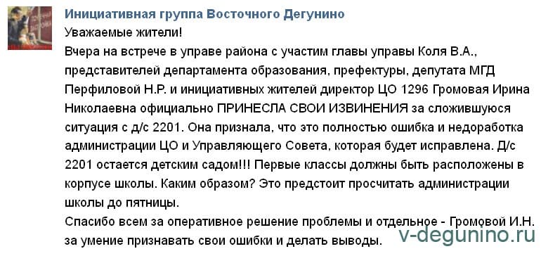 Вчера на встрече в управе района с участим главы управы Коля В.А., представителей департамента образования, префектуры, депутата МГД Перфиловой Н.Р. и инициативных жителей директор ЦО 1296 Громовая Ирина Николаевна официально ПРИНЕСЛА СВОИ ИЗВИНЕНИЯ за сложившуюся ситуация с д/с 2201. Она признала, что это полностью ошибка и недоработка администрации ЦО и Управляющего Совета, которая будет исправлена. Д/с 2201 остается детским садом!!! Первые классы должны быть расположены в корпусе школы. Каким образом? Это предстоит просчитать администрации школы до пятницы.