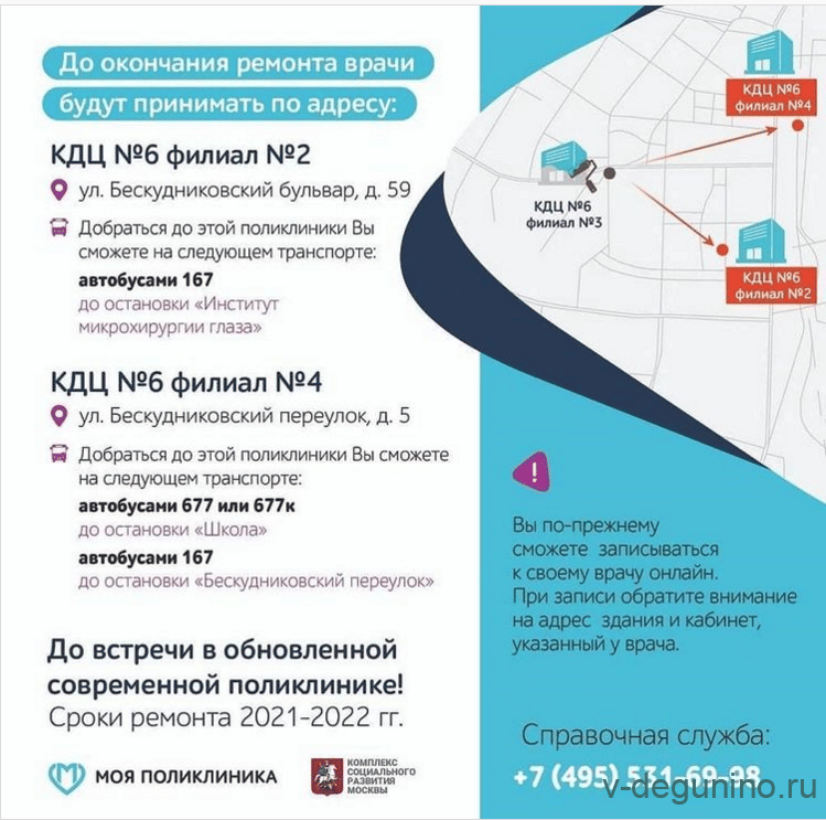 Жителям района Восточное Дегунино предлагается обращаться в клинико-диагностическом центр № 6 филиал № 2 по адресу: Бескудниковский бульвар, д. 59 или в в клинико-диагностическом центр № 6 филиал № 4 по адресу: Бескудниковский переулок д. 5.