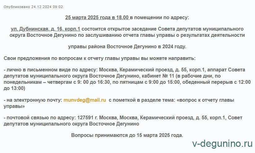 ул. Дубнинская, д. 16, корп.1 состоится открытое заседание Совета депутатов муниципального округа Восточное Дегунино по заслушиванию отчета главы управы о результатах деятельности