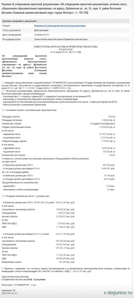 Решение об утверждении проектной документации «Об утверждении проектной документации, включая смету, «Дошкольное образовательное учреждение» по адресу: Дубнинская ул., вл. 34, корп. Б, район Восточное Дегунино (Северный административный округ города Москвы)» № 155-УПД от 30 июля 2014 г.