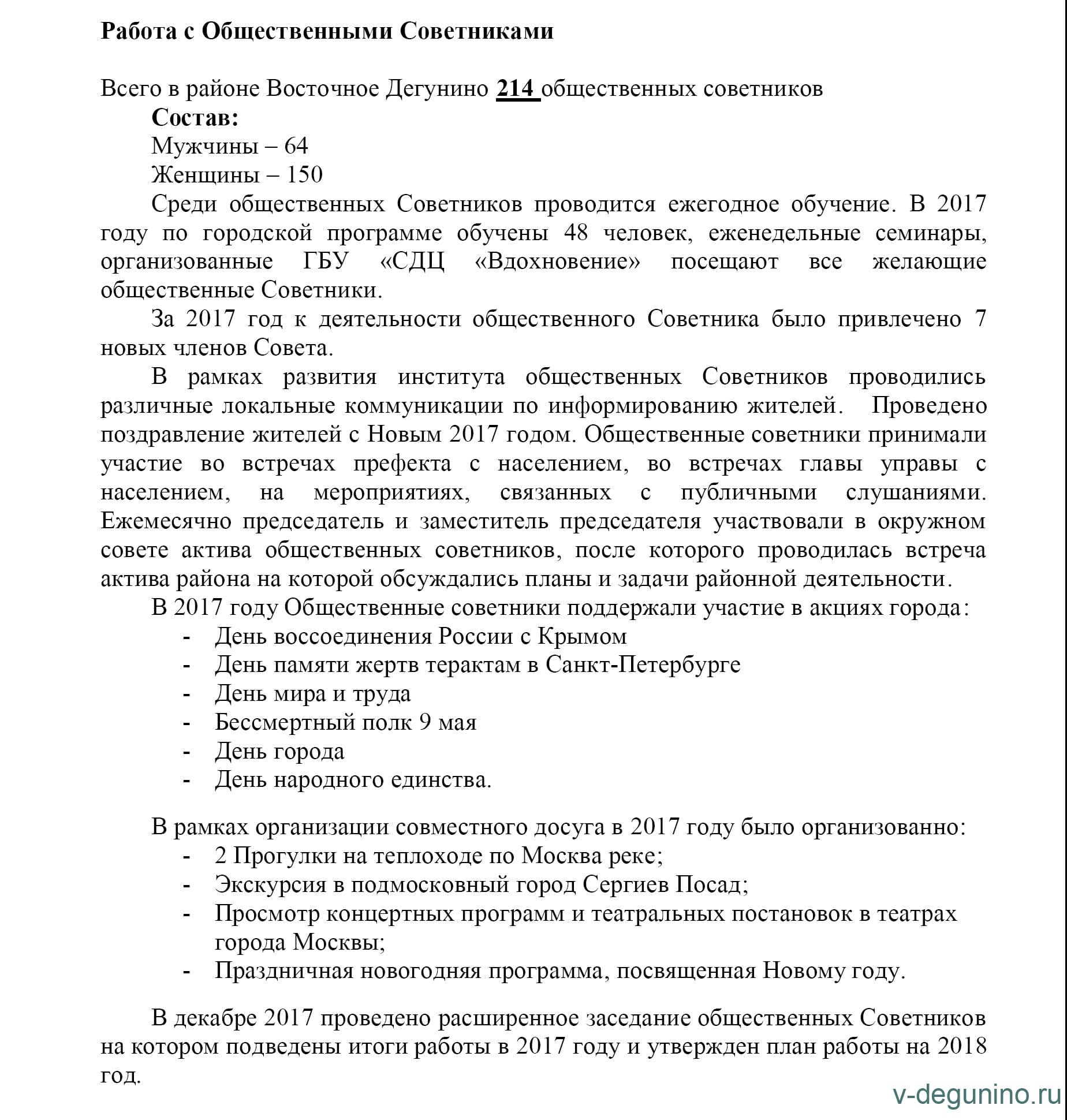 Из Годового отчёта главы управы района Восточное Дегунино Коля В. А.