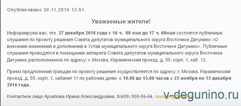 В Дегунино писал(а):Источник цитаты 3. Назначить на 25 декабря 2016 года с 16 ч. 00 мин до 17 ч. 00мин в помещении аппарата Совета депутатов муниципального округа Восточное Дегунино расположенном по адресу: г. Москва, Керамический проезд, д. 55, корп. 1, каб. 12 публичные слушания по проекту решения.