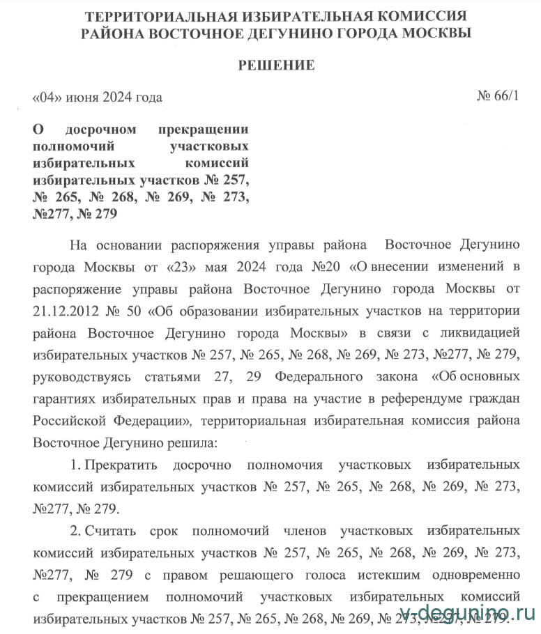Решение территориальной избирательной комиссии района Восточное Дегунино города Москвы № 69/1 от 11 июня 2024 года «О назначении членов участковых избирательных комиссий избирательных участков №№ 258, 261, 264, 267, 270, 274, 275, 280 с правом решающего голоса вместо выбывших»