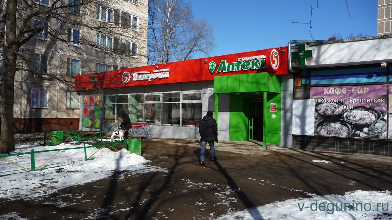 У платформы Дегунино, рядом с Почтой, на месте Аптеки, 14 марта 2017 года открылся магазин "Пятёрочка".