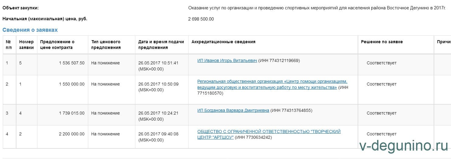 на оказание услуг по организации и проведению спортивных мероприятий для населения района Восточное Дегунино в 2017 г.
